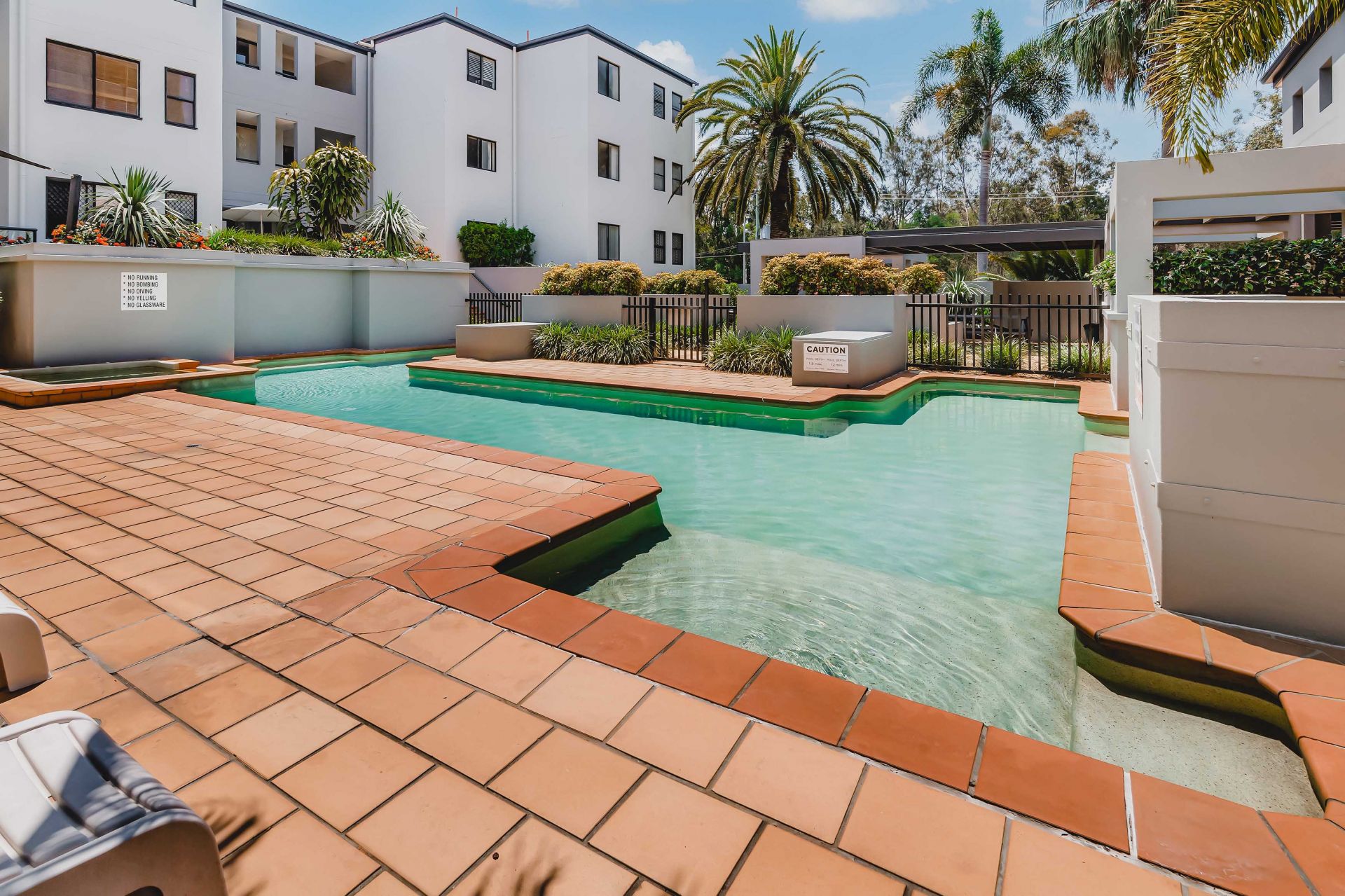 This quiet, beautifully Renovated, 2 Bed, 2 Bath, 2 Balcony, 2 Car Spaces ( on title ) with Lift access unit, is located in the South West corner with Canal and Hinterland views. The unit is fully furnished and air conditioned.